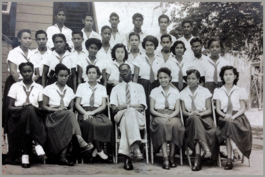 Front (l-r): Angela Telesford, Irma Patterson, Elsa Richards, Mr Hall (Form Master), Shirley Jones(Jones), Norma Wilkes, Alma Lum Ser(Lee Singh)