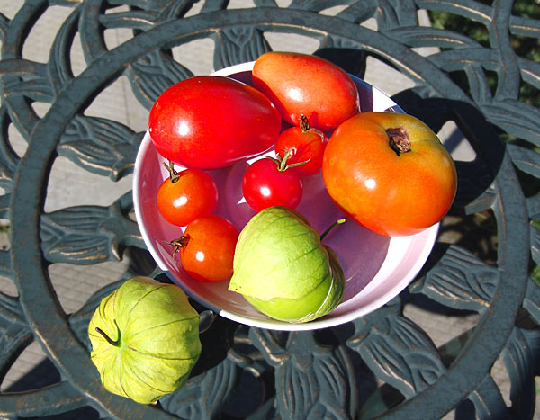 Today, (26th of Sept, 84^F, perfect blue sky), a neighbour wrapping up his garden for the impending winter, gave me a Mexican tomato, of which hitherto I had never heard. The bush doesn't look or smell like a tomato plant, and it doesn't ripen red, more slight yellow.